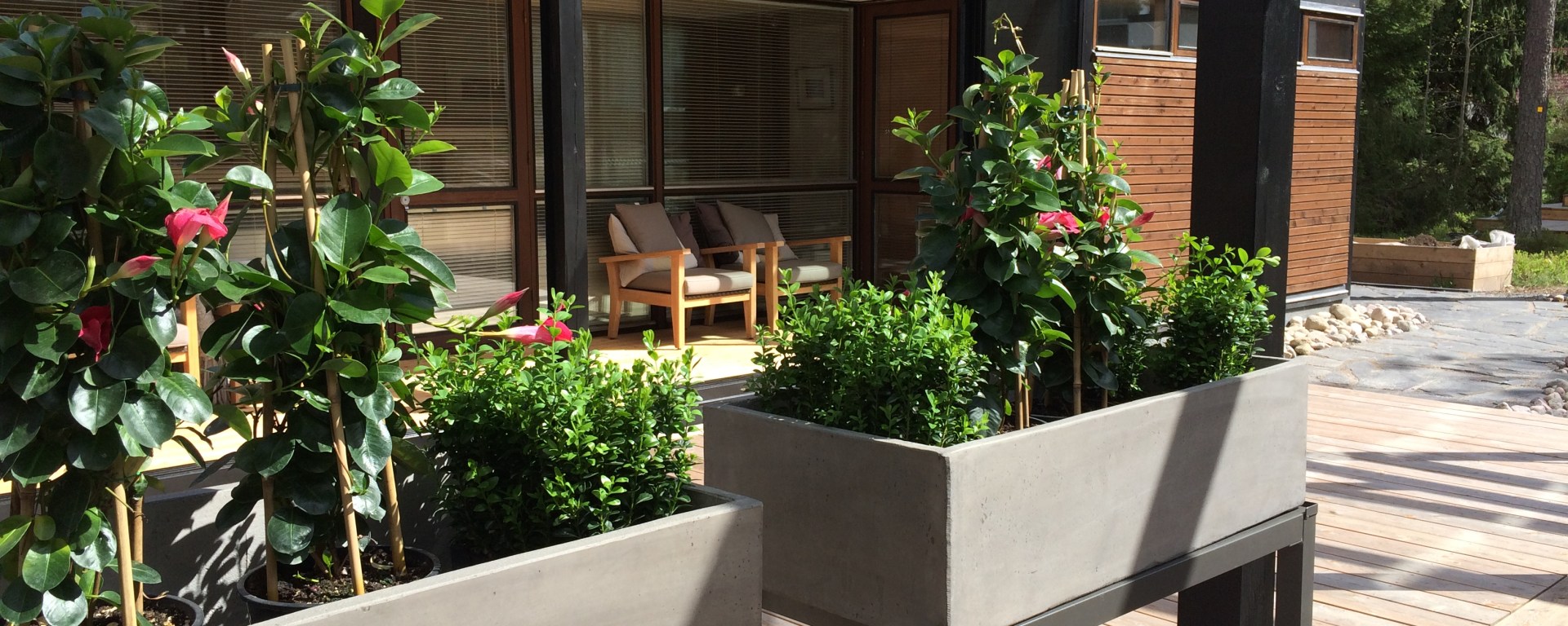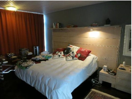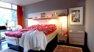 Yläkerran makuuhuoneessa koko seinä on ikkunaa, joten huoneen pimentämiseen tarvitaan paksut pimennysverhot.