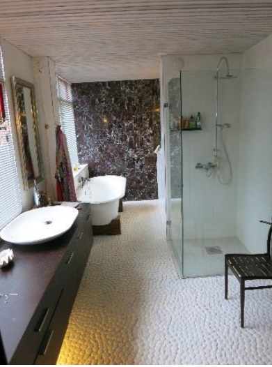 Makuuhuoneen vieressä, etsatun lasioven takana on pukeutumistila ja kylpyhuone. Myös pesutiloissa on suuret ikkunat. Kylpyhuoneen takaseinä on päällystetty persialaisella punaisella marmorilla. Lattialaattana on käytetty valkoista Rantakivi-erikoislaattaa ja kivipuristemosaiikkia. Kalusteiksi on valittu tummaa puuta.