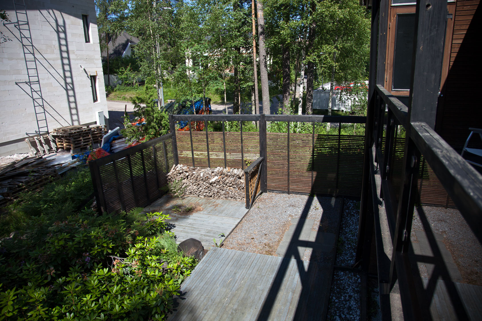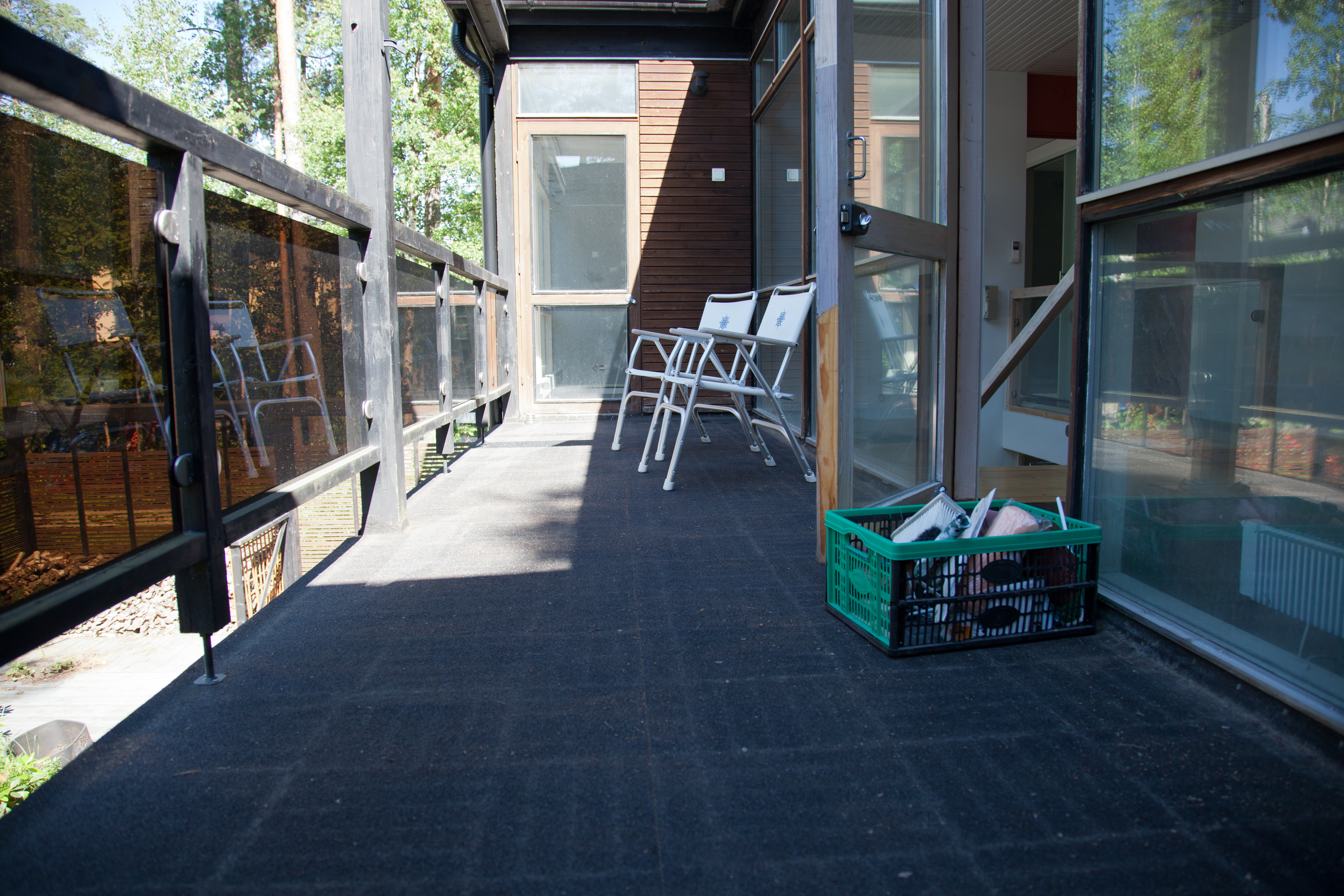 Taloa esiteltäessä parvekkeella oli puiset ritilät, mutta taloon tullesani ne oli viety pois. Minulle kerottiin, että kauppaan eivät kuulu parvekkeen markiisi ja pukeutumistilan peilit, muusta ei ollut puhetta.
