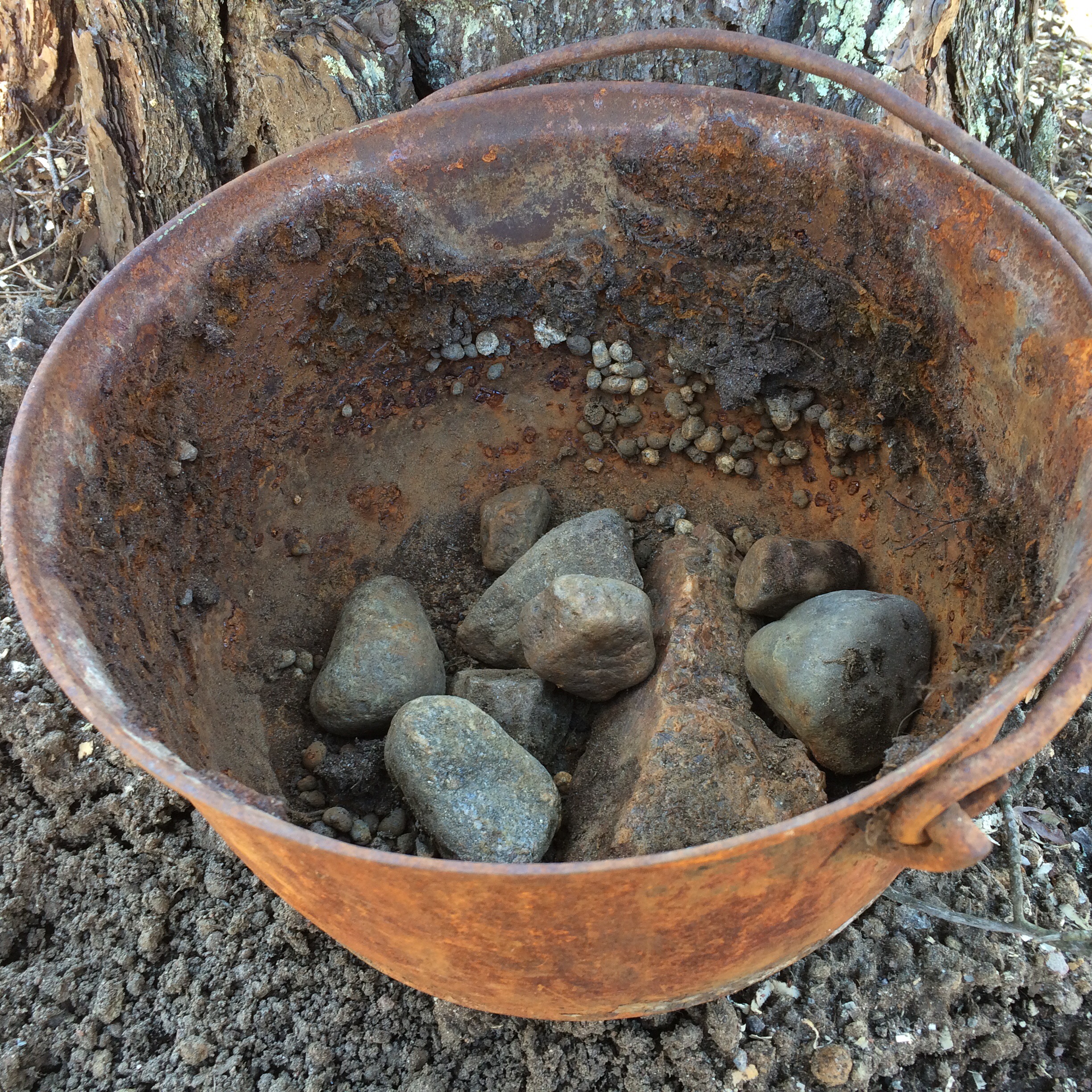 Padan pohjalle laitetaan kiviä salaojaksi. Tällöin ylimääräinen vesi valuu kivien sekaan eikä multa jää liian märäksi. Kivien ja mullan väliin voi laittaa sanomalehtipaperia tai vaikka kuivuneita lehtiä jolloin multa ei sekotu kiviin. Koska rautapata on pieni, rutistin sanomalehteä kivien päälle.