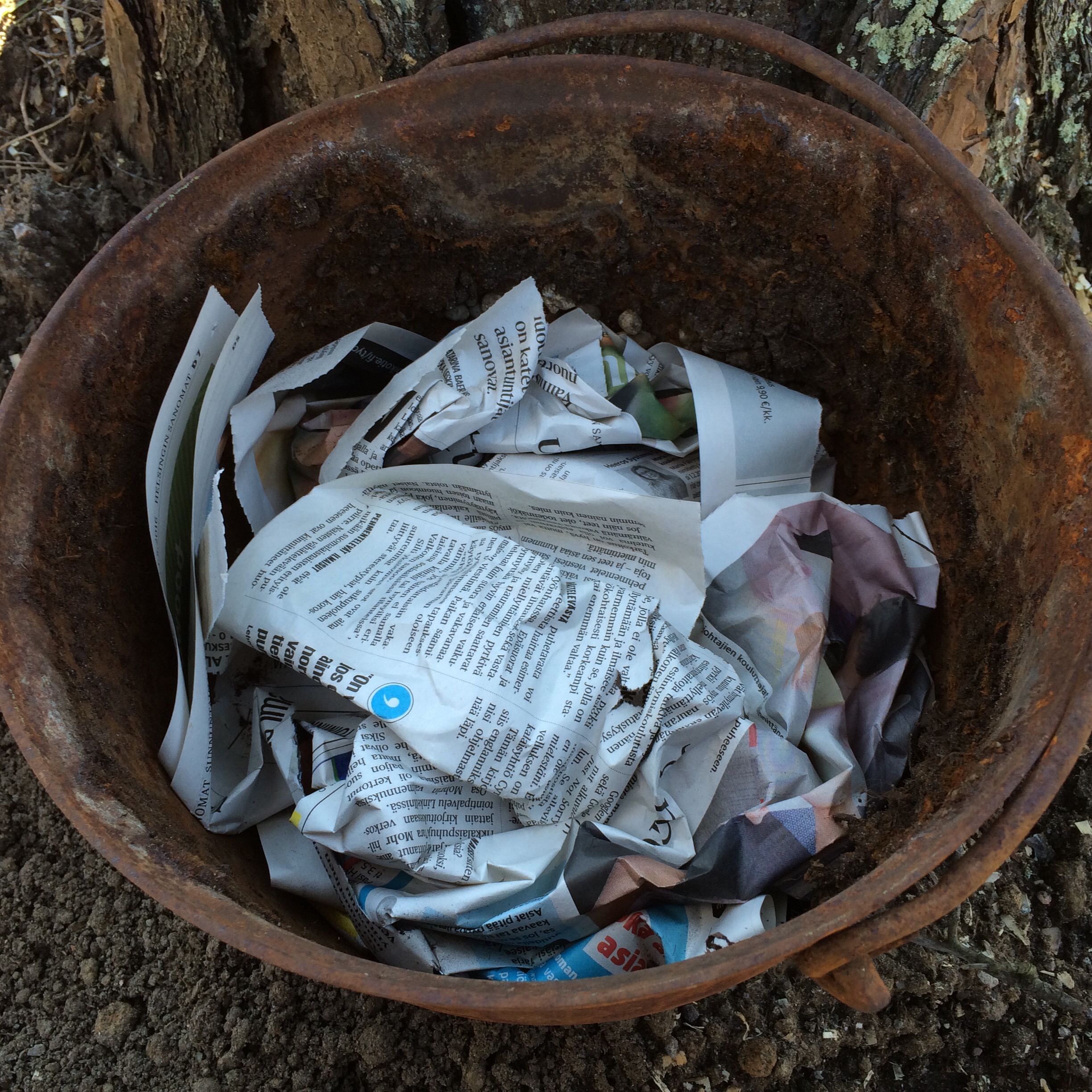 Nyt salaoja padan pohjalla pysyy avoinna, kun multa on omana kerroksenaan sanomalehtien päällä.
