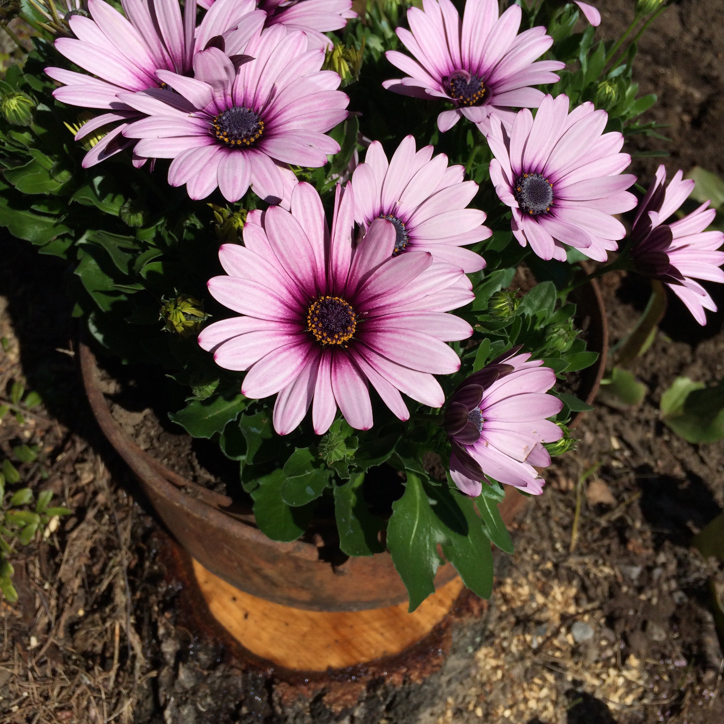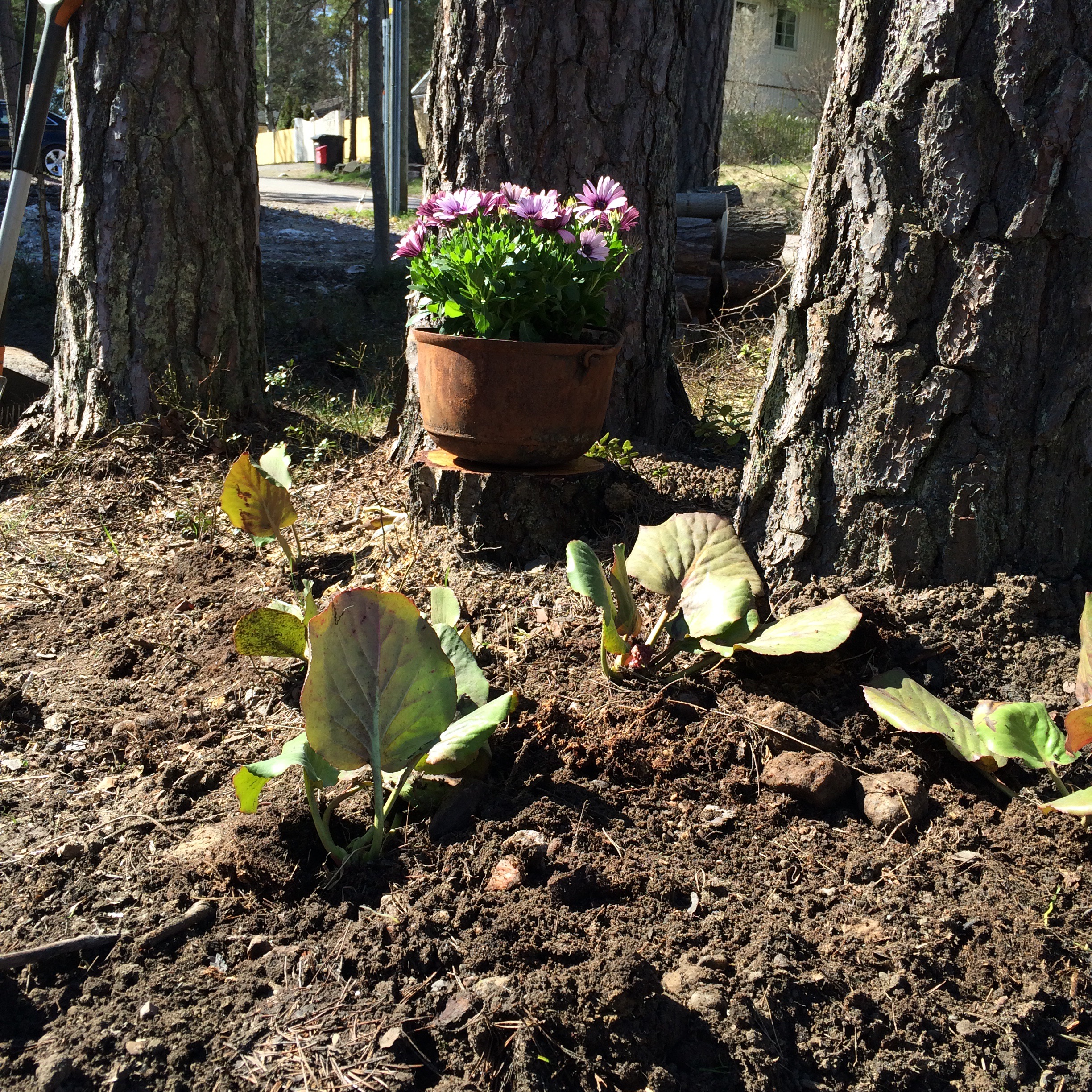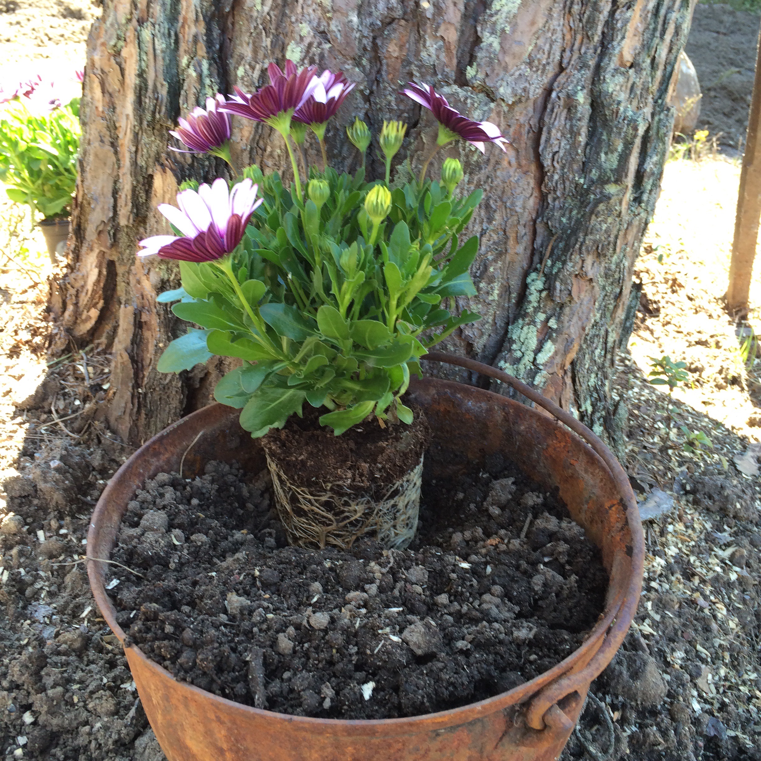 Tähtisilmät istutetaan rautapataan, jonka ostin muutama vuosi sitten kirpputorilta 5 eurolla. Ensimmäisenä kesänä pata oli kukkaruukkuna vuokramökillä Inkoossa. Tämän jälkeen pata on ollut varastossa, kunnes löysin sen siivotessani varastoa. Padassa kukat pääsevät oikeuksiinsa, mutta koska se on umpinainen, istuttaminen pitää tehdä huolella.
