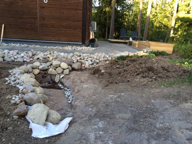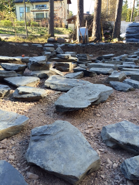 Vielä on tekemättä liuskekivipolku terassilta etupihalle ja istutukset.