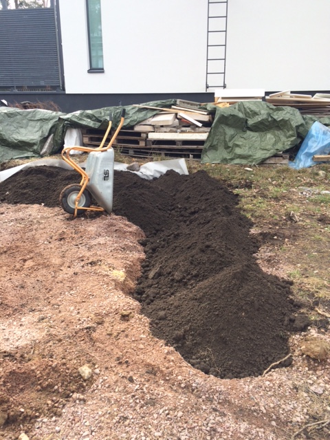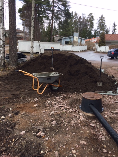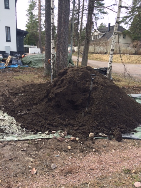 Rakastan kukkia ja kasveja. Suurin kukkamaa tulee etupihalle, johon on tuotu 8 m3 multaa. Kun kasa multaa kipattiin tontille, ajattelin että nyt tuli tilattua roimasti yli tarvittavan määrän ja olimme jo aikeissa myydä osa mullasta naapureille. Onneksi kuitenkaan ei myyty, sillä muurin valmistuttua multa ei riittänytkään täyttämään muuria. Tänään siis haemme lisää multaa.