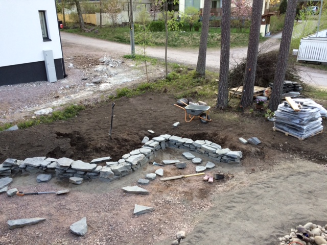 Kukkamaan reunaan rakennettiin liuskekivilouheesta muuri, jonka rakentamisesta voit lukea lisää tästä. Aikamoinen urakka ja vaatii hyvät lihakset kuten myös hermot.