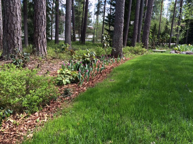 Nurmikko kasvaa kohisten ja metsään on istutettu alppiruusuja. Tätä tonttia ei enää tunnista parin vuoden takaiseksi ja hyvä niin. Linkkiä painamalla pääset katsomaan, miltä tontilla näytti vuonna 2014.