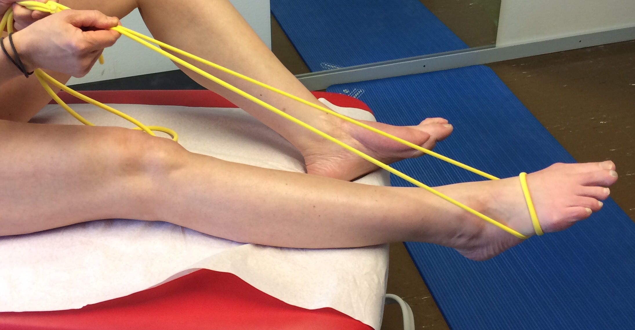 Neljän kuukauden jälkeen tapaturmasta aloitettiin pohjelihaksen vahvistaminen aluksi oheisella kuminauhalla ja sen jälkeen nousemalla varpaille ja alas. Fysioterapeutin ohjauksessa kannattaa käydä, jotta liikkeet tekee oikealla tavalla.