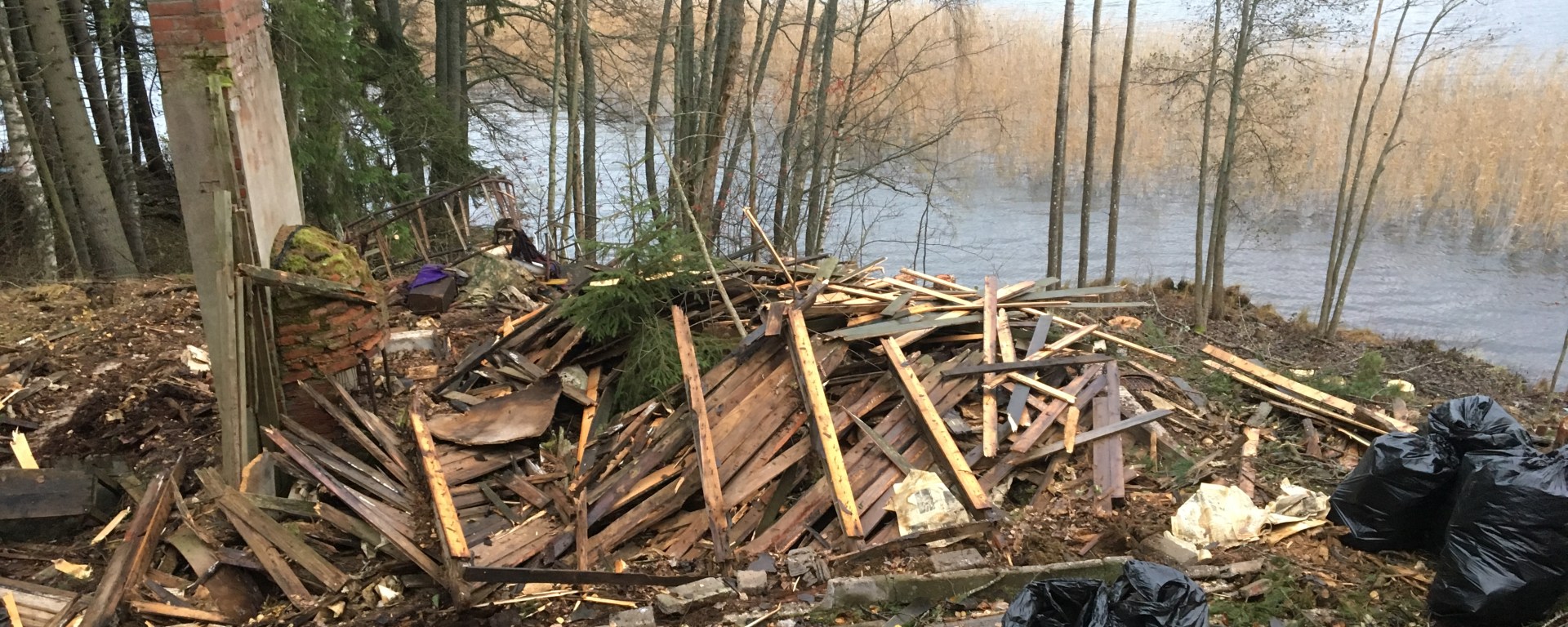 Parisen viikkoa sitten menimme mr H:n kanssa tontille moukarin, sorkkaraudan ja jätesäkkien kanssa tarkoituksenamme kerätä kaikki tervapaperi ja -pahvi rakenteista. Mökissä oli takaseinä pystyssä, lisäksi osa sortuneista seinistä oli vielä kasassa. Parisen tuntia moukaria heiluttaen saimme laudat irti toisistaan ja pääsimme keräämään PAH-aineita sisältävät tervapaperit ja -pahvit jätesäkkeihin. Käsittelymme jälkeen talosta oli jäljellä piippu, sokkeli ja kasa lautoja.