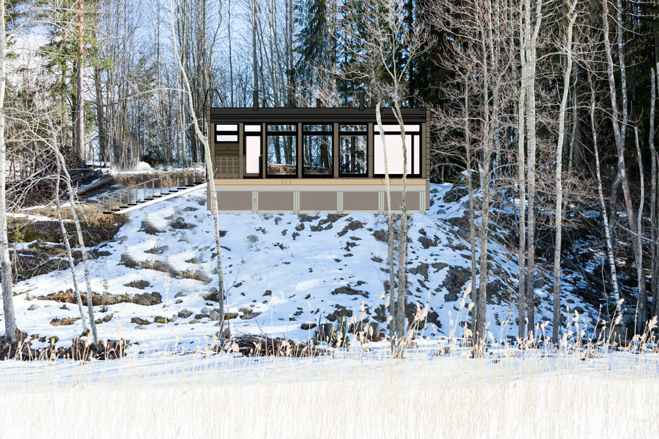 Miltä Glass house näyttää tontilta? Joltakin tällaiselta se näyttää, tosin mökki nousee noin 1/2 metriä korkeammalle kuin se on kuvassa. Kun sain kuvan valmiiksi mietin, onko mökki piirretty liian suureksi. Mökki näyttää nimittäin todella isolta. Kuukauden kuluttua alkaa mökki nousta tontille ja voin verrata tekemääni kuvaan miltä mökki todellisuudessa näyttää. Jännää nähdä miltä vastaava kuva näyttää kesän lopulla. Siihen mennessä pitää jostain hankkia vene, että pääse järveltä ottamaan kuvan.