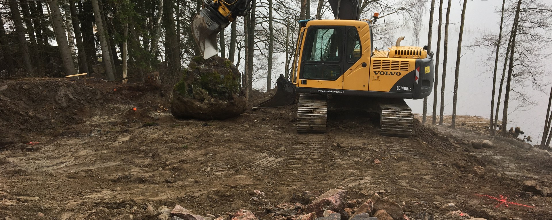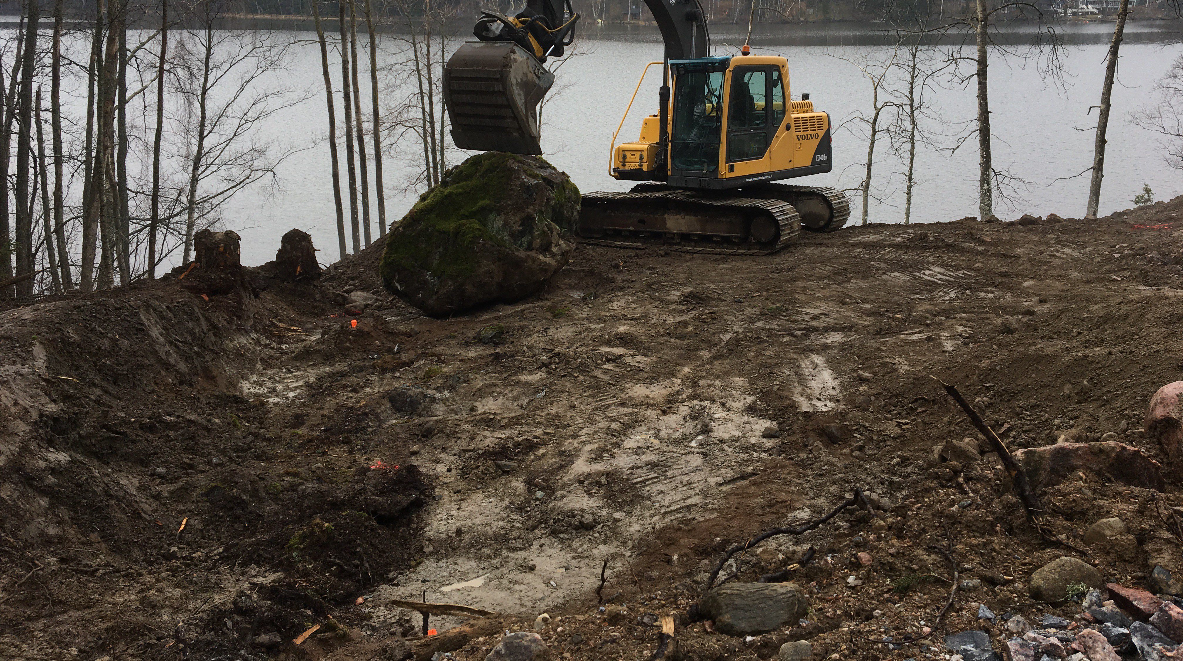 Käydessäni tontilla totesin, että kivet olikin siirretty rinteen reunaan kiviröykkiöksi. Kiviröykkiö on järveltä päin katsottuna todella hallitseva ja vaatii melkoisen määrän maisemointia. Harmittaa, mutta eiköhän tuosta röykkiöstä vielä jotakin saada loihdittua. Sen edistymistä voit seurata blogissani :)
