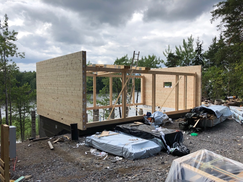 Talopaketti saapui huvilan pihalle kesäkuun toisella viikolla ja kuvittelin rakentamisen alkavan välittömästi. Mitä vielä, juhannus sotki kaiken: ennen juhannusta eikä sen jälkeisellä viikolla tapahtunut yhtään mitään, sillä rakennusporukka vietti juhannusta oikein urakalla Virossa. Lisäksi sateen vuoksi runko oli paketissa vielä juhannuksen jälkeenkin.