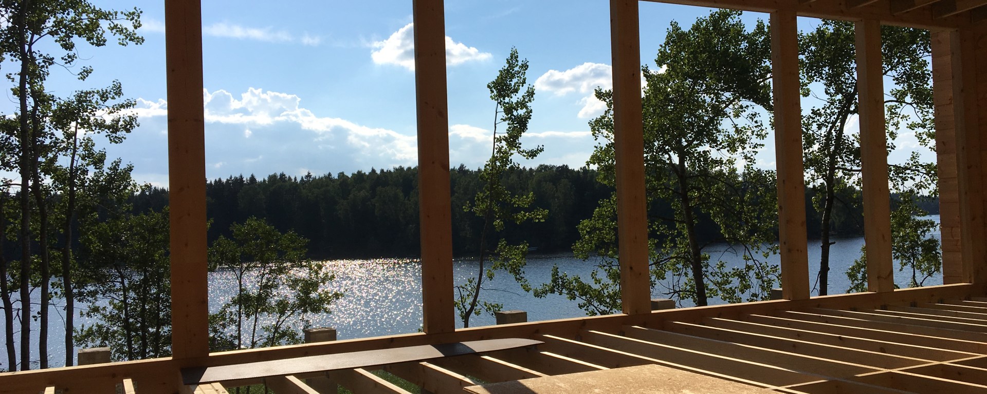 Ajoimme illalla fiilistelmään ja juomaan harjakaisjuomat! Vasta nyt katon ja lattiaruoteiden asentamisen jälkeen aloin hahmottaa, miltä huvilassa näyttää sitten, kun se on valmis.