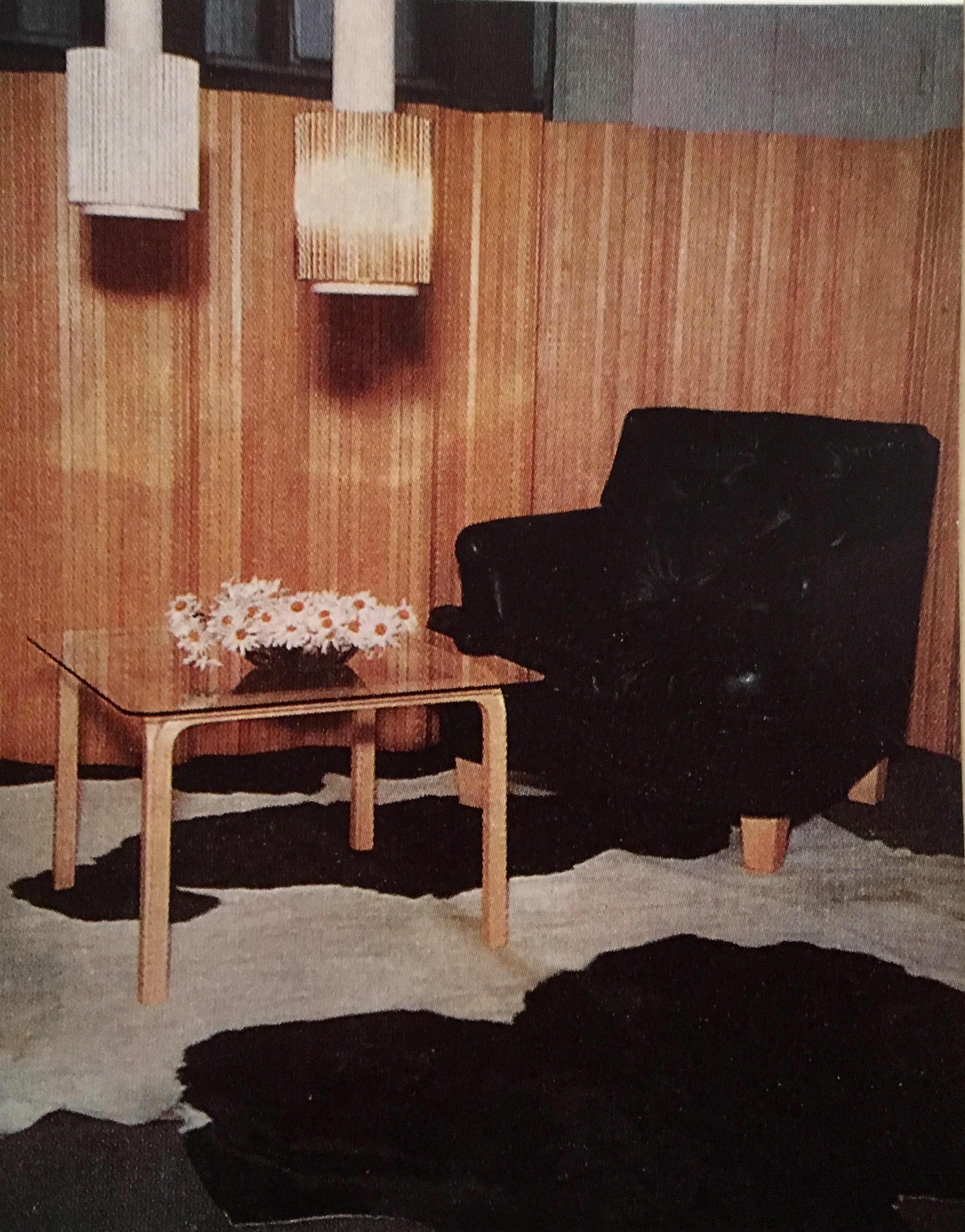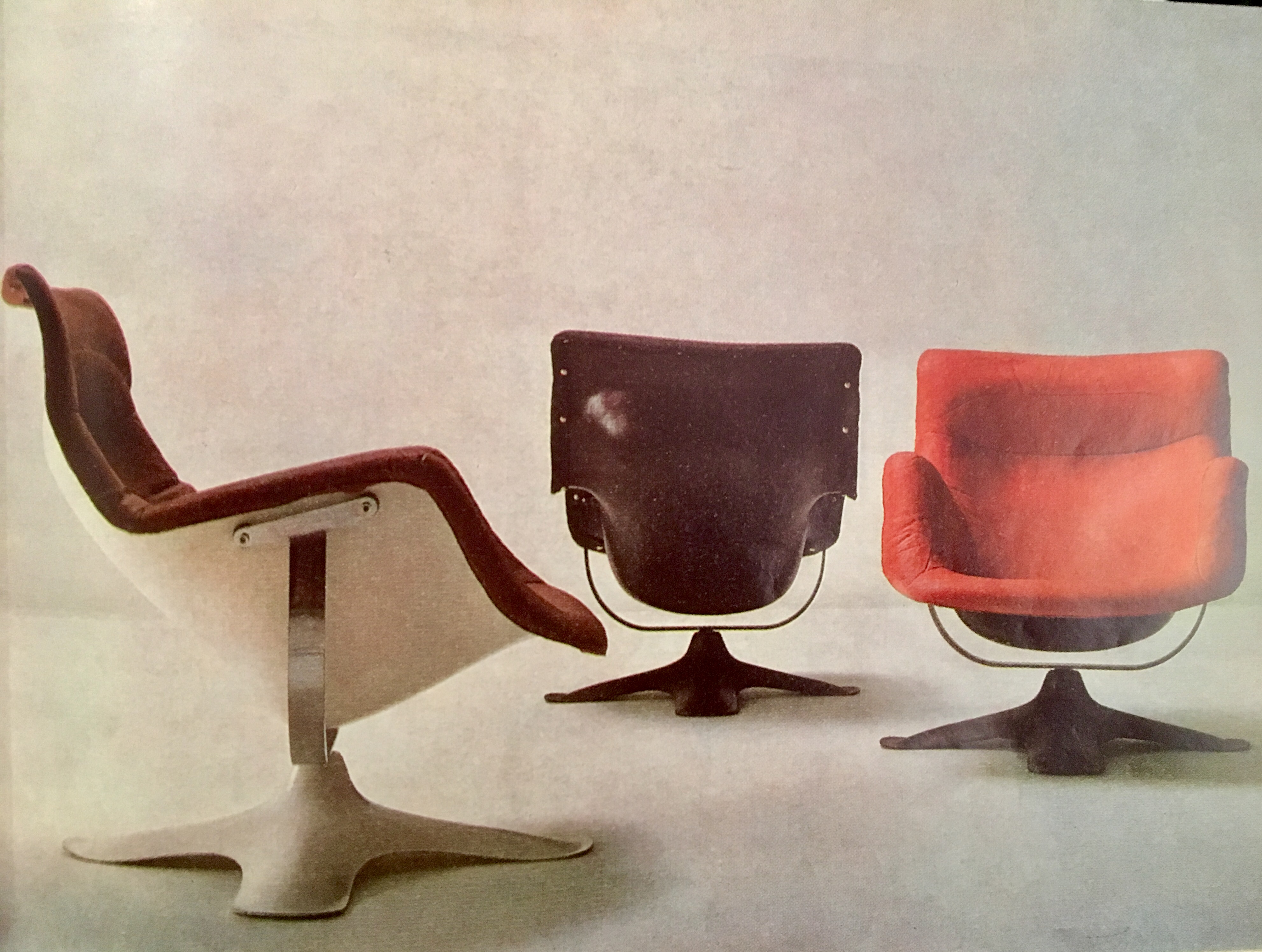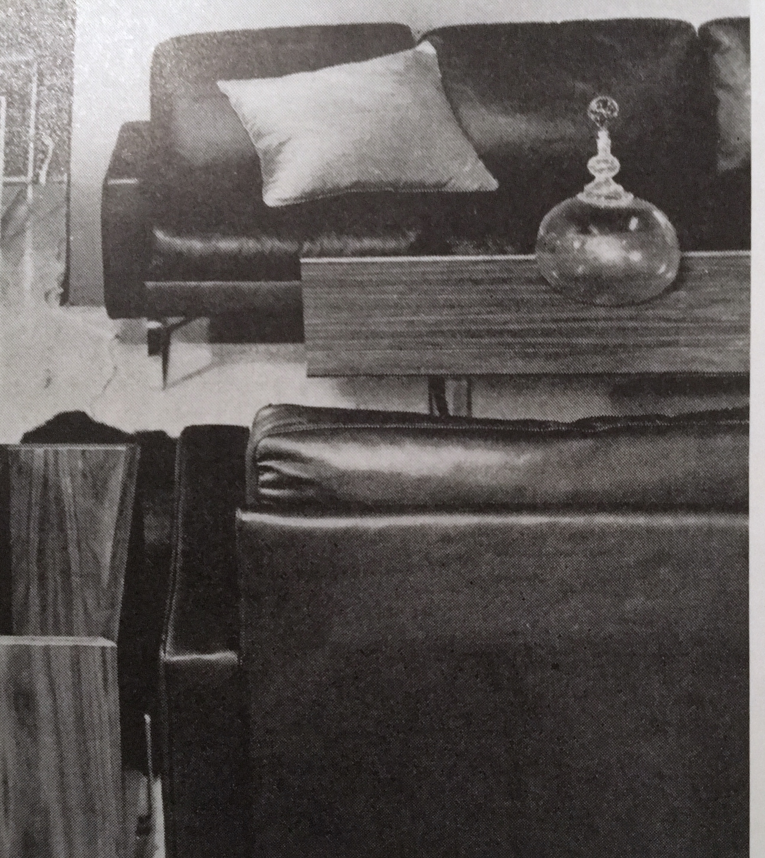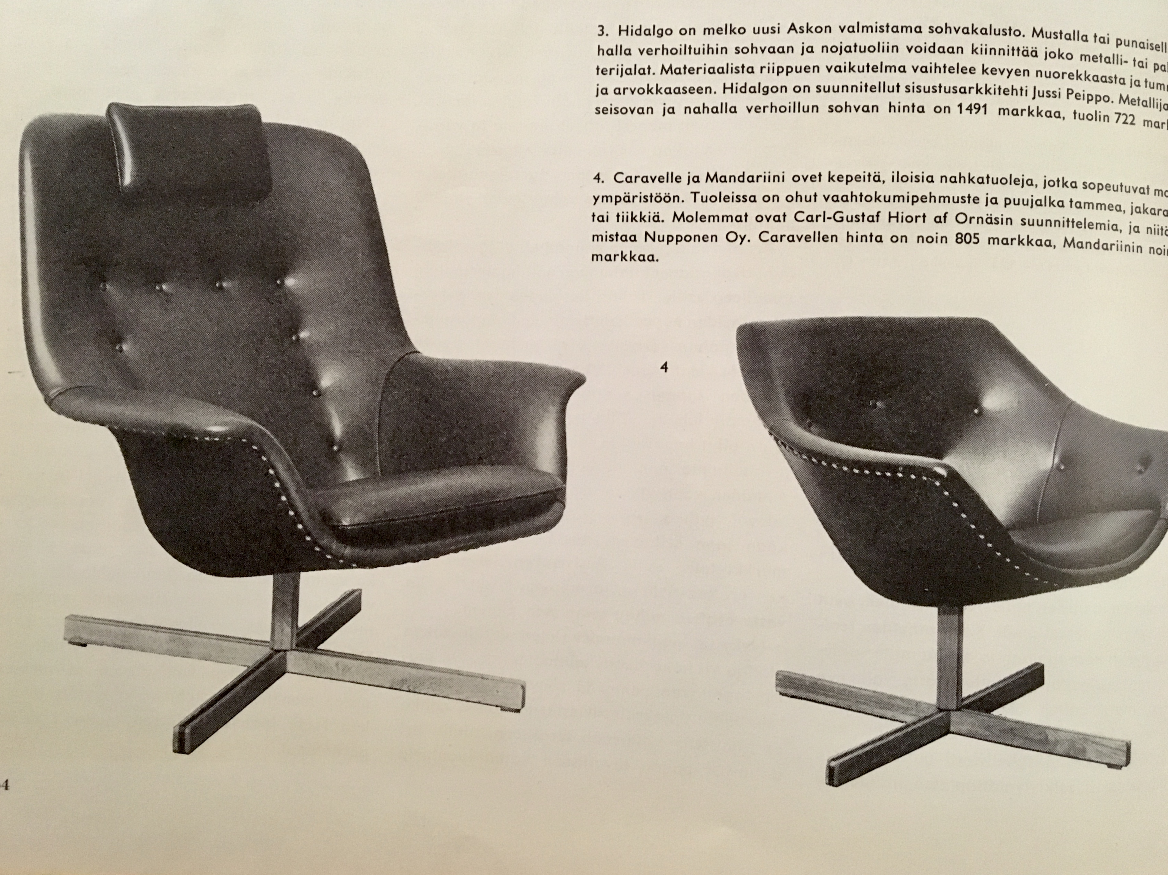 Kuvassa olevat nahkasohvat ja -tuolit ylhäältä vasemmasta nurkasta oikealle ovat: Yrjö Kukkapuron Karuselli (Haimi Oy), sisustusarkkitehti Jussi Piipon Hidalgo nahkasohva (Asko), Carl-Gustaf af Hjortnäsin Caravelle ja Hidalgo nahkatuoli (Nupponen Oy), Yrjö Kukkapuron Ateljee sohva- ja nojatuolisarja (Haimi Oy), Alvar Aallon 1930-luvulla suunnittelema nojatuoli (Artek). Kuvat on kopioitu Kaunis koti 6/1965 lehdestä.