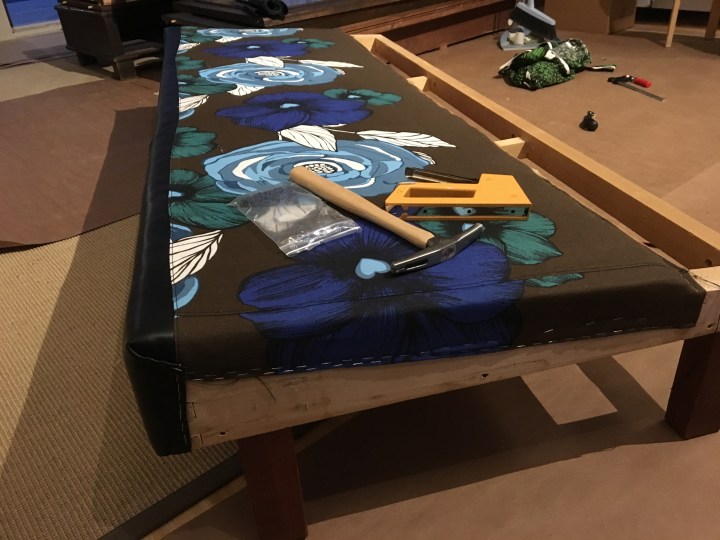 Olin erittäin tyytyväinen sen jälkeen, kun olin ommellut nahkapalat toisiinsa kiinni ja nahan kiinni kankaaseen. Pakkasin kamat kassiin ja ajoin Lohjalle kunnostamaan sohvaa.