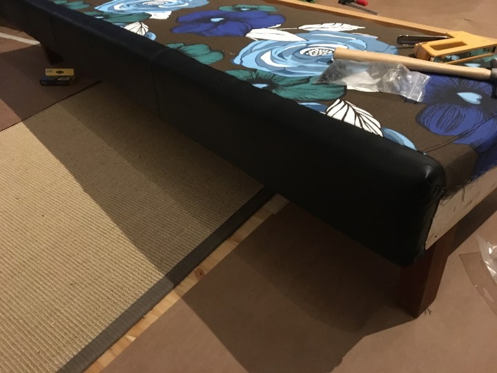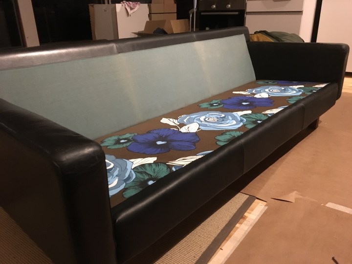 Sohvan etureunassa oleva nahka peittää ainoastaan etureunan ja tyynyjen alla on nahkaan kiinni ommeltu kangas. Yleensä käytetään edullista valkaisematonta lakanakangasta, mutta nyt päätin ottaa Fidasta ostetun kankaan käyttöön.