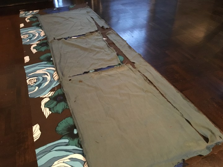 Alla olevassa kuvassa on repaleinen vanha kangas mallina uuden leikkaamista varten. Kannattaa muuten säilyttää kaikki puretut osat malliksi, pääsee huomattavasti helpommalla kuin itse arvuuttelemalla kokoa ja mallia.
