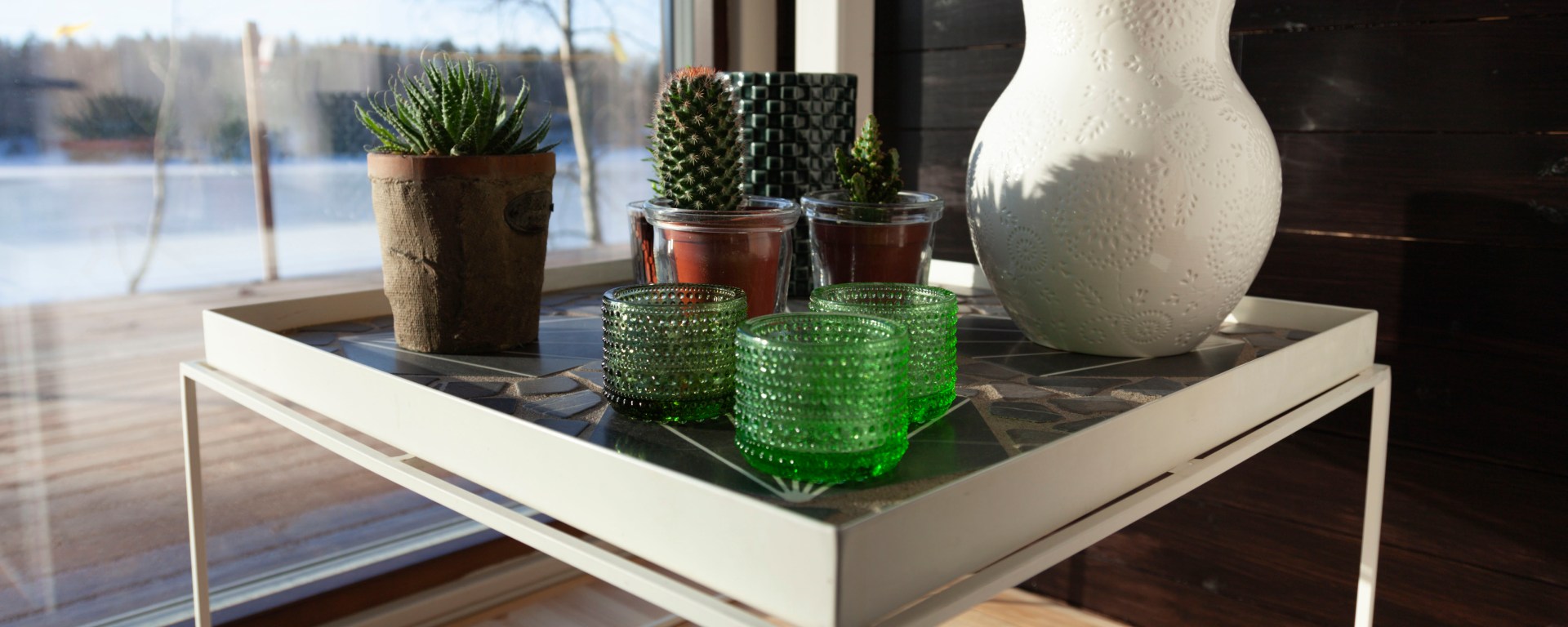 Meillä on kaksi Hay:n valkoista tarjotinpöytää, joista toinen on 60 x 60 cm ja toinen 30 x 30 cm. Pöydät ovat suuressa suosiossa ja niitä löytyy usean sisustuksesta bloggaavan kotoa.