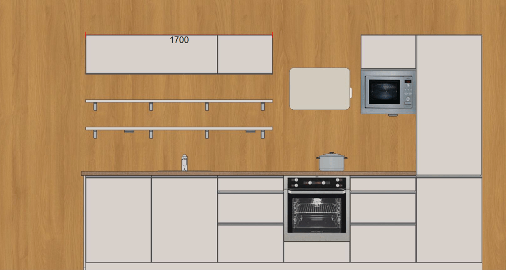 Yläkaapistosta halusin mahdollisimman kevyen, joten päädyimme 40 cm korkeaan kaapistoon ja kahteen hyllyyn. Lisäksi keittiöön valittiin Noblessan oma kodinkonemerkki Junker, joka on Siemensin valmista, mutta Noblessan oma edullisempi vaihtoehto.