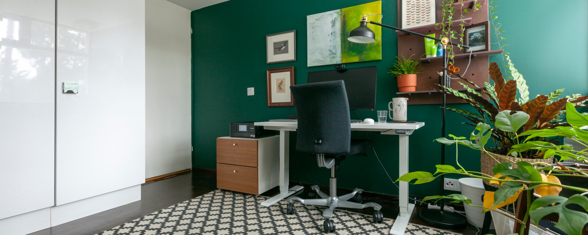 Työskentely vihreässä työhuoneessa inspiroi todella paljon. Muutama piristävä lisäväri, valkomusta matto ja valkoinen kaapisto raikastavat sisustusta. Ja viherkasvit luovat kodikkuutta puhdistaen samalla ilmaa.