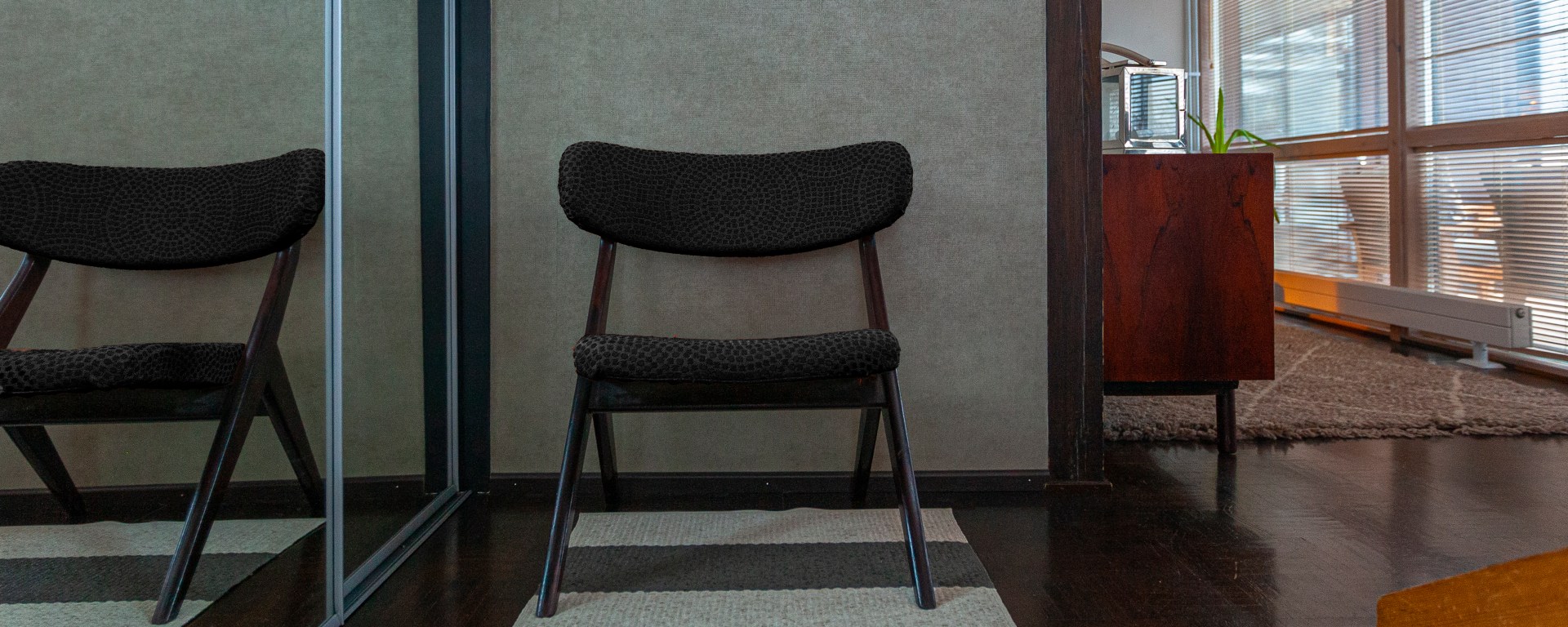Näiden värikokeilujen perusteella olen päätymässä tumman harmaaseen väriin. Kun jatkamme remonttia edemmäs käytävälle, maalaan samalla nyt ruskean tukipalkin tumman harmaaksi. Näin tumma harmaa kehystää seinää ja luo raamin Bambino-tuolille.