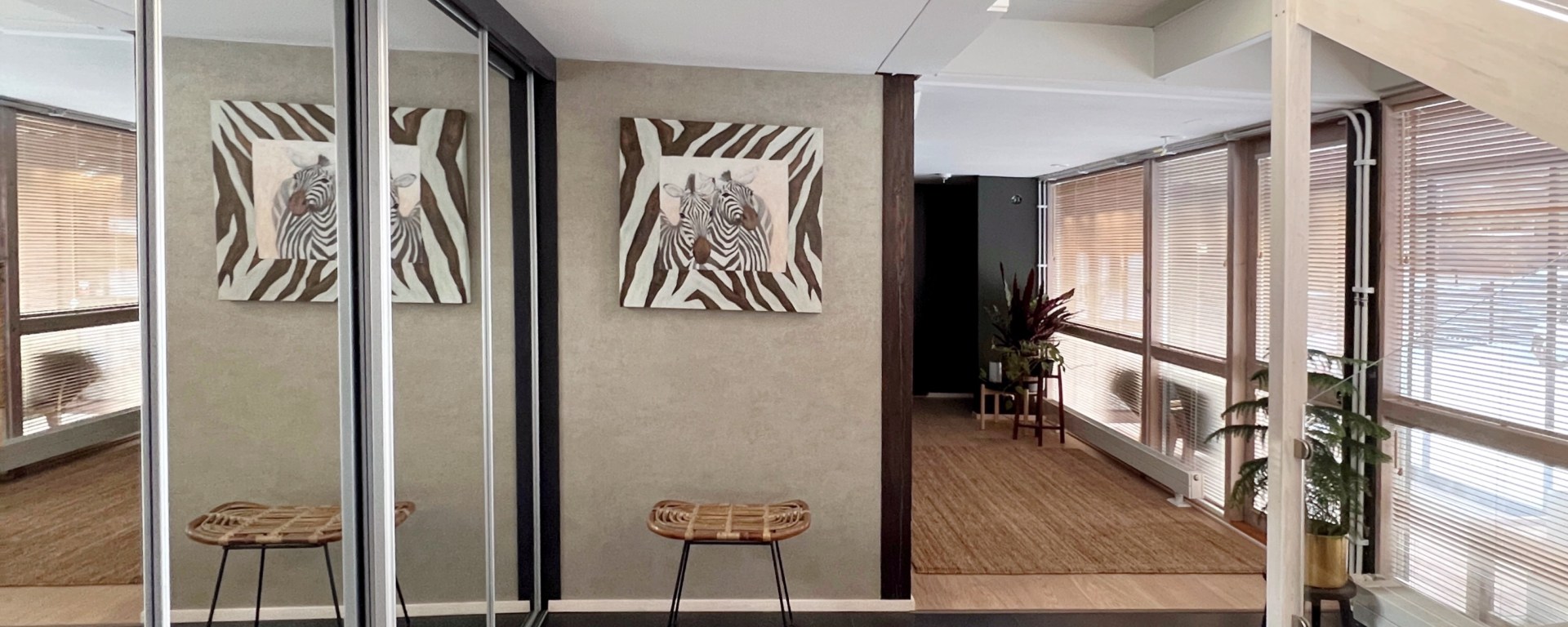 Kun lähdin suunnittelemaan eteistä, tavoitteenani oli luoda moderni ja lämminhenkinen tila, joka toivottaa tulijan tervetulleeksi. Sisustuselementeiksi valitsin taiteilija Hannu Nikanderin maalaaman seepra-aiheisen taulun, kevyen rottinkituolin, kasveja ja pyöreän sisalmaton. Miksi muuten päädyin pyöreään mattoon?