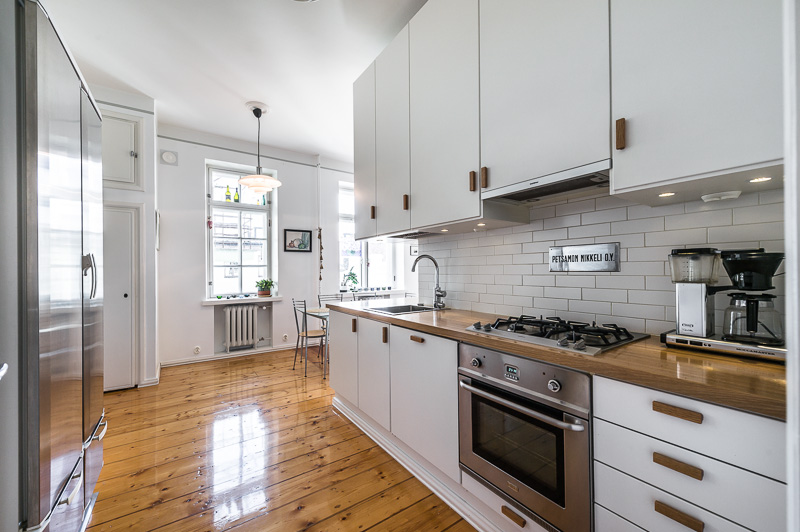 Kodinkoneet hankittiin Gaggenaulta, Smegiltä ja Porkalta. Keittiössä on alkuperäinen puulattia, joka kaivettiin muovimaton alta. Hionnan ja lakkauksen jälkeen siitä tuli upea.